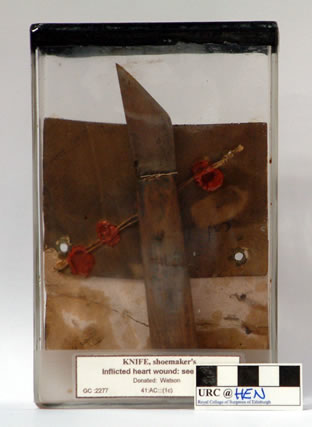 Edinburgh was one of the first cities in Great Britain to establish a police department, and city policemen were generally prompt and professional in investigating crimes. The Police Surgeon, Alexander Black, followed strict procedures for handling forensic evidence, such as comparing the alleged weapon, like the knife pictured above, with the size of wounds inflicted on the heart. But the Police Establishment, as it was known, was a branch of city administration, and had numerous duties beyond criminal investigation, including "apprehending and punishing vagrants and disorderly persons, suppression of common begging, removing nuisances, lighting and cleaning the streets and passages," and generally preserving "peace and good order. " They relied on city residents to bring suspected crimes to their attention. For that reason their inquiry into Burke's and Hare's activities only began once Ann and James Gray, two of Burke's lodgers, reported their discovery of Madgy Docherty's body.