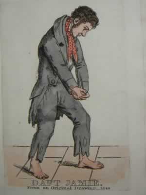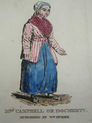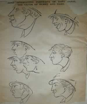 The three murders that caught the attention of the public were Mary Paterson, James Wilson (better known as Daft Jamie), and Madgy (Margaret, or Margery) Docherty (also known as Campbell). Paterson, also identified as Mary Mitchell, was thought to be a "girl of the street," that is, a prostitute, and rumors circulated about her extroadinary beauty. Wilson was a well-known street figure, with a mother and sister living. Docherty was the last victim, and the only cadaver examined by the police. These were the three victims named in the indictment, and for that reason the press printed every scrap of information, real or invented, that they could find about them. There was a brisk trade in hand colored prints purporting to represent the victims, but Wilson's was the only likeness drawn by an artist who had actually seen him alive. Years later, sketches of Daft Jamie turned up in the papers of the artist R. C. Bell, and his son presented them to the Edinburgh City Museum.